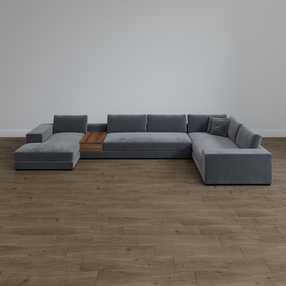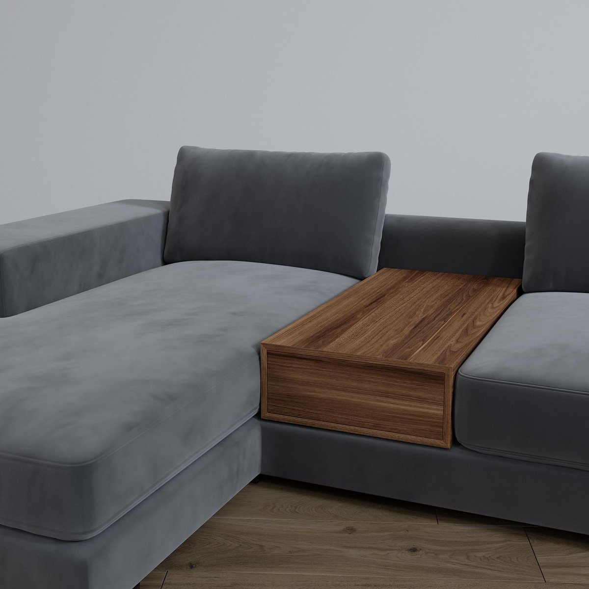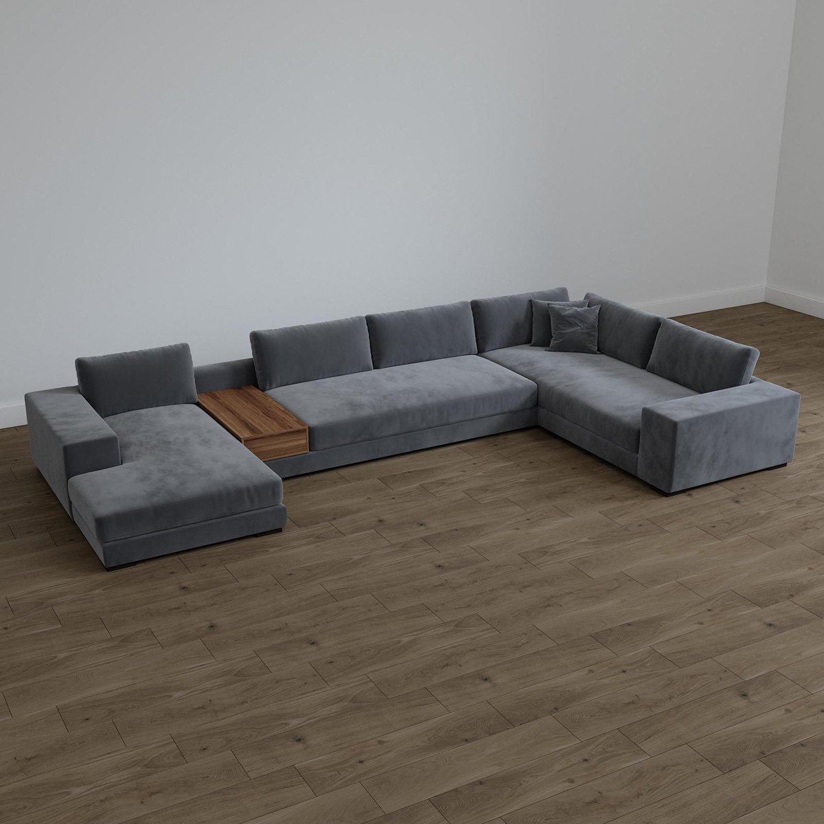 The backrests are composed of evenly spaced rectangular cushions, maintaining a clean, structured aesthetic. A built-in wooden platform table is integrated between two seating modules, adding warmth and contrast with its natural wood tone while serving as a functional surface for décor or everyday items.
