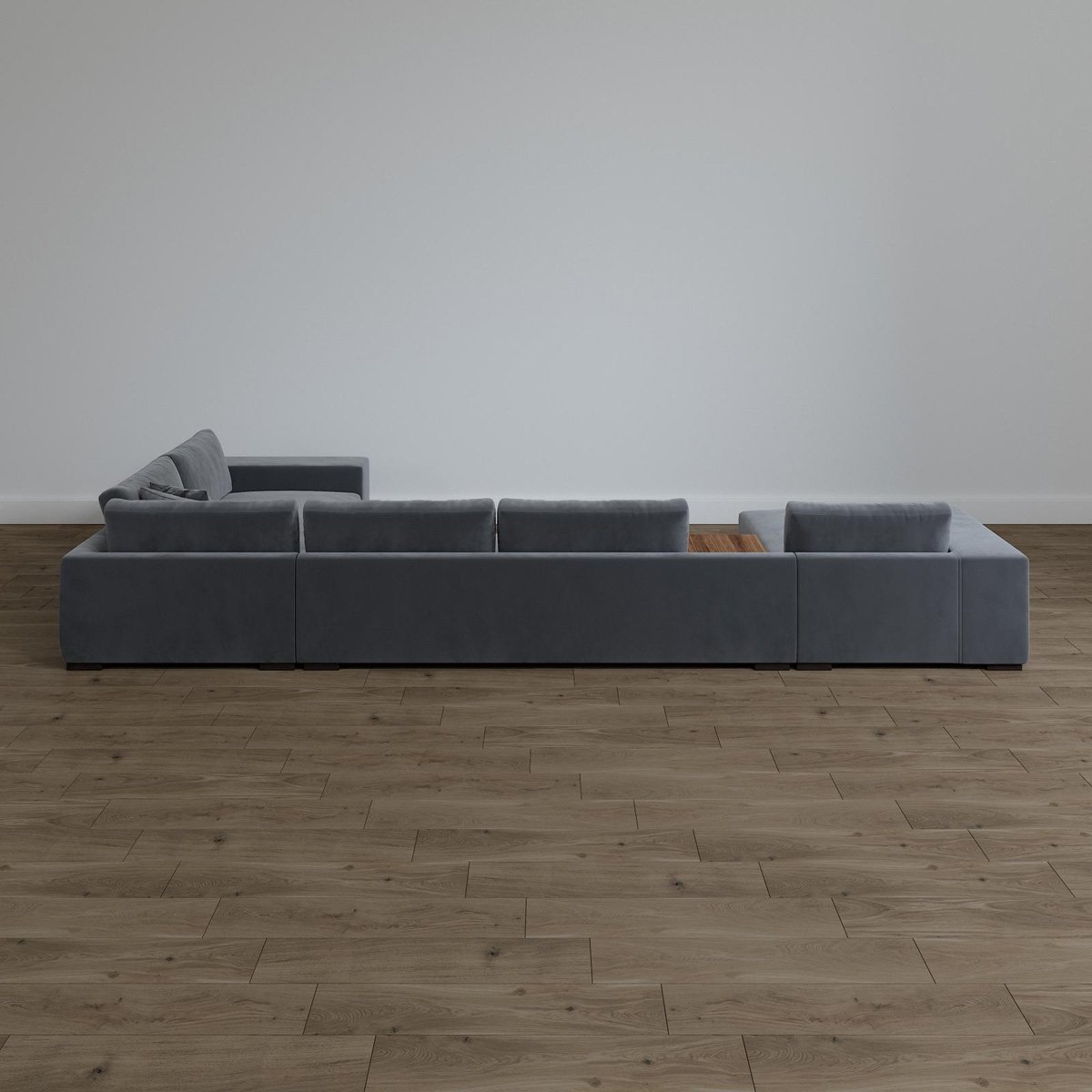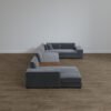 Jasper is a large, contemporary modular sectional sofa with a low, streamlined profile. It features deep seating and wide cushions upholstered in a smooth, performance fabric that gives it a refined, modern look. The configuration forms an L-shape on the one side and includes an extended chaise on the other, providing ample lounging space.